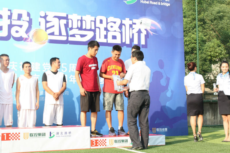 颁奖仪式在参赛代表方队及工作人员的阵阵掌声中隆重举行,获奖团体代表纷纷上台领奖,联投集团综合办公室主任、工会副主席项益明、联投集团建管部部长高俊普、联投集团综合办公室副主任王进力依次为冠、亚、季军颁发了奖状和奖杯。