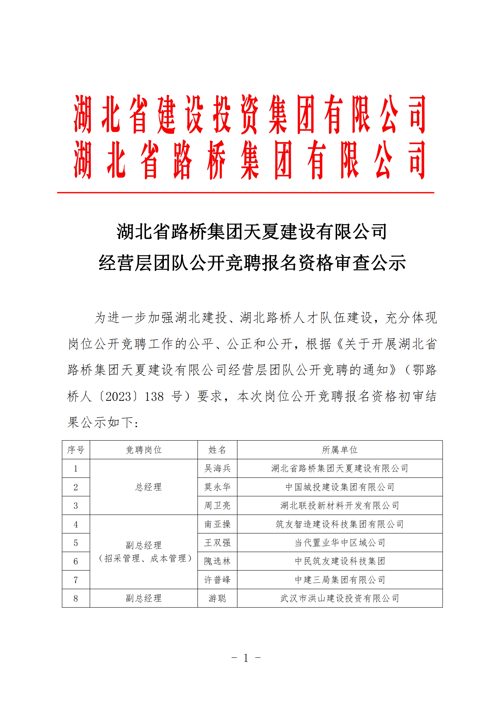 湖北省路桥集团天夏建设有限公司经营层团队公开竞聘报名资格审查公示