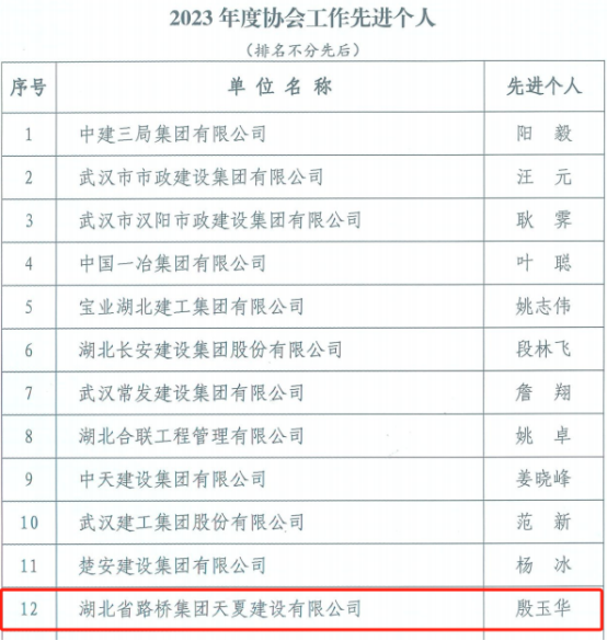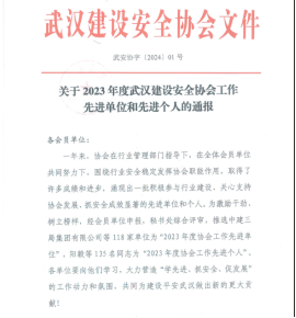 初心如磐守安全,砥砺奋进谱新篇。近日,武汉建设安全协会就2023年建筑行业安全生产方面评选了一批先进单位和先进个人,海博体育天夏公司荣获“2023年度协会工作先进单位”称号,天夏公司副总经理殷玉华、安全总监付建国荣获“2023年度协会工作先进个人”称号。