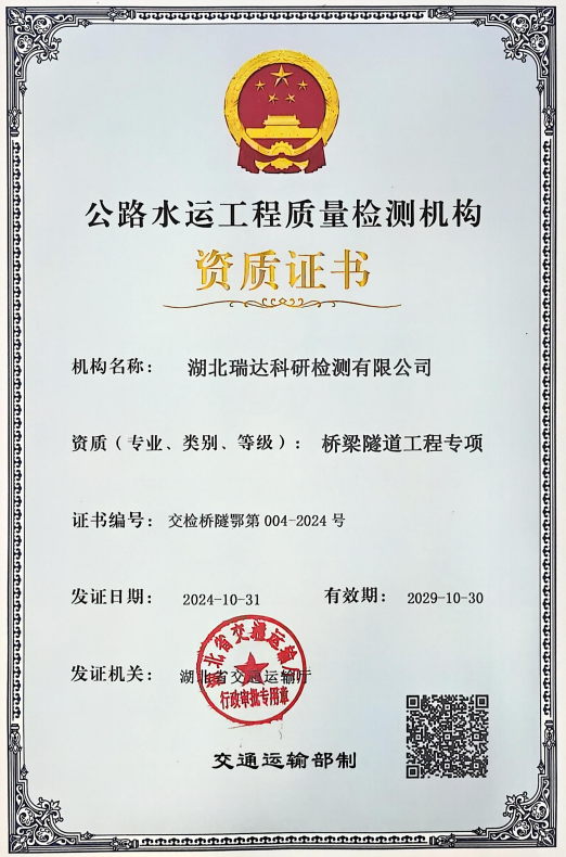 桥梁隧道工程专项资质是试验检测机构在桥梁隧道工程领域具备的特定资质。在取得该资质后,瑞达科研检测公司可承担桥梁施工监控、桥梁荷载试验、桥梁支座、桥梁伸缩装置、隧道超前地质预报、隧道监控量测、钢结构等桥梁隧道工程质量检测业务。