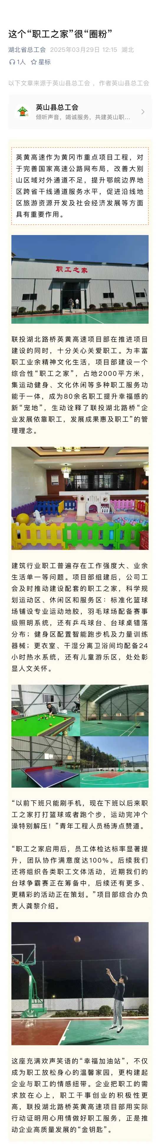联投海博体育英黄高速项目部在推进项目建设的同时,十分关心关爱职工。为丰富职工业余精神文化生活,项目部建设一个综合性“职工之家”,占地2000平方米,集运动健身、文化休闲等多种职工服务功能于一体,成为80余名职工提升幸福感的新“宠地”,生动诠释了联投海博体育“企业发展依靠职工,发展成果惠及职工”的管理理念。近日,湖北省总工会进行深入报道,全文如下: