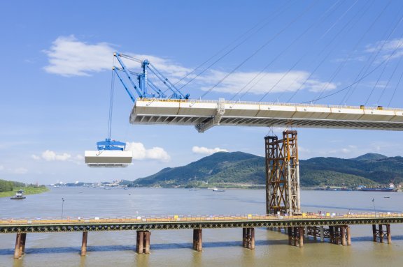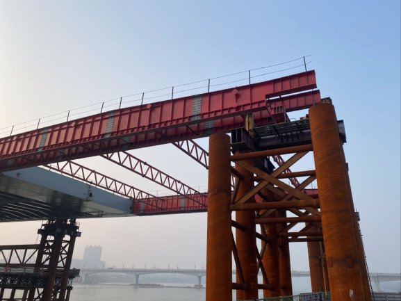依托丹江口市水都二桥工程,研发了大吨位龙门吊与钢梁拼装平台共用支架技术、大跨径大断面钢箱梁拼装线性变形控制技术及钢箱梁节段精准对接补强连接技术,解决了龙门吊支架与钢梁拼装平台支架交叉混乱、龙门吊轨道场地要求高的难题,提高了钢箱梁节段对接安装精度和连接强度,在有效工期内完成了各项指标,获得社会各方的高度好评。