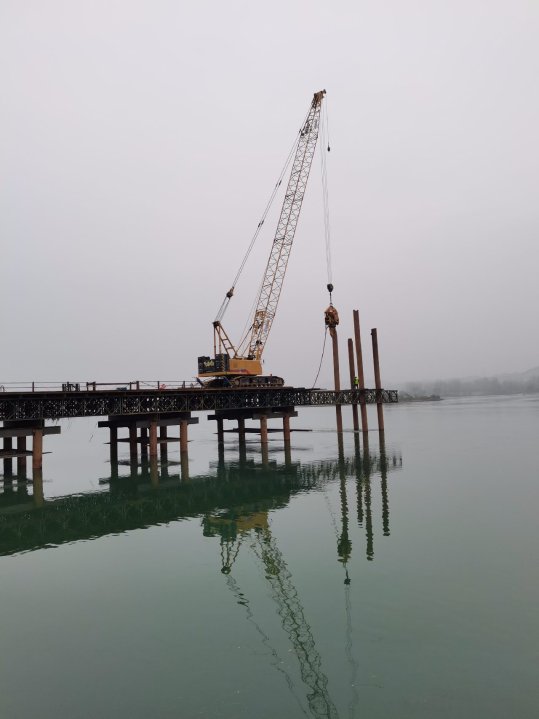 依托丹江口市水都二桥工程,通过“板凳+局部锚固”钢管桩抗高流速水情施工技术、钢管桩沉桩无引孔技术及钢栈桥快速装配施工技术等关键技术,顺利完成了钢栈桥施工。通过钢管桩直接振动沉桩形成“板凳桩”,提高了栈桥横向稳定性,同时直接振打钢管桩沉桩,管内无需浇筑砼,提高了施工效率,降低了施工成本,此外,依次装配安装钢栈桥各类装配构件以及装配式定位导向架,减少了大量现场焊接工作,加快了施工速度,具有较好的推广应用前景。