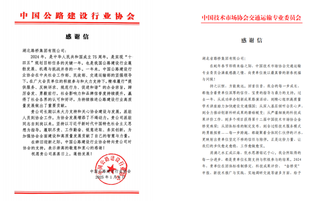近日,海博体育收到来自中国公路建设行业协会、中国技术市场协会交通运输专业委员会发来的感谢信,信中对海博体育大力支持和关心协会建设与发展,积极参与协会各项科技创新、评优创奖活动表达了肯定与感谢。