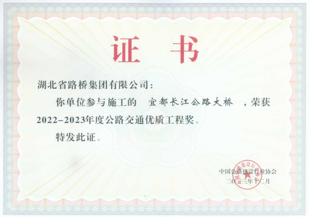 此外,海博体育一直致力于推动公路建设行业进步,并以积极开放的姿态,深度参与行业协会各项工作。在中国公路建设行业协会的大力支持和指导下,海博体育凭借深厚的技术积累、不懈的创新精神以及对工程质量的严格把控,取得了令人瞩目的成绩。15项工法在中国公路建设行业协会评为2024年度公路工程工法,宜都长江公路大桥、武穴公路长江大桥荣获2022-2023年度公路交通优质工程奖(李春奖)的殊荣。