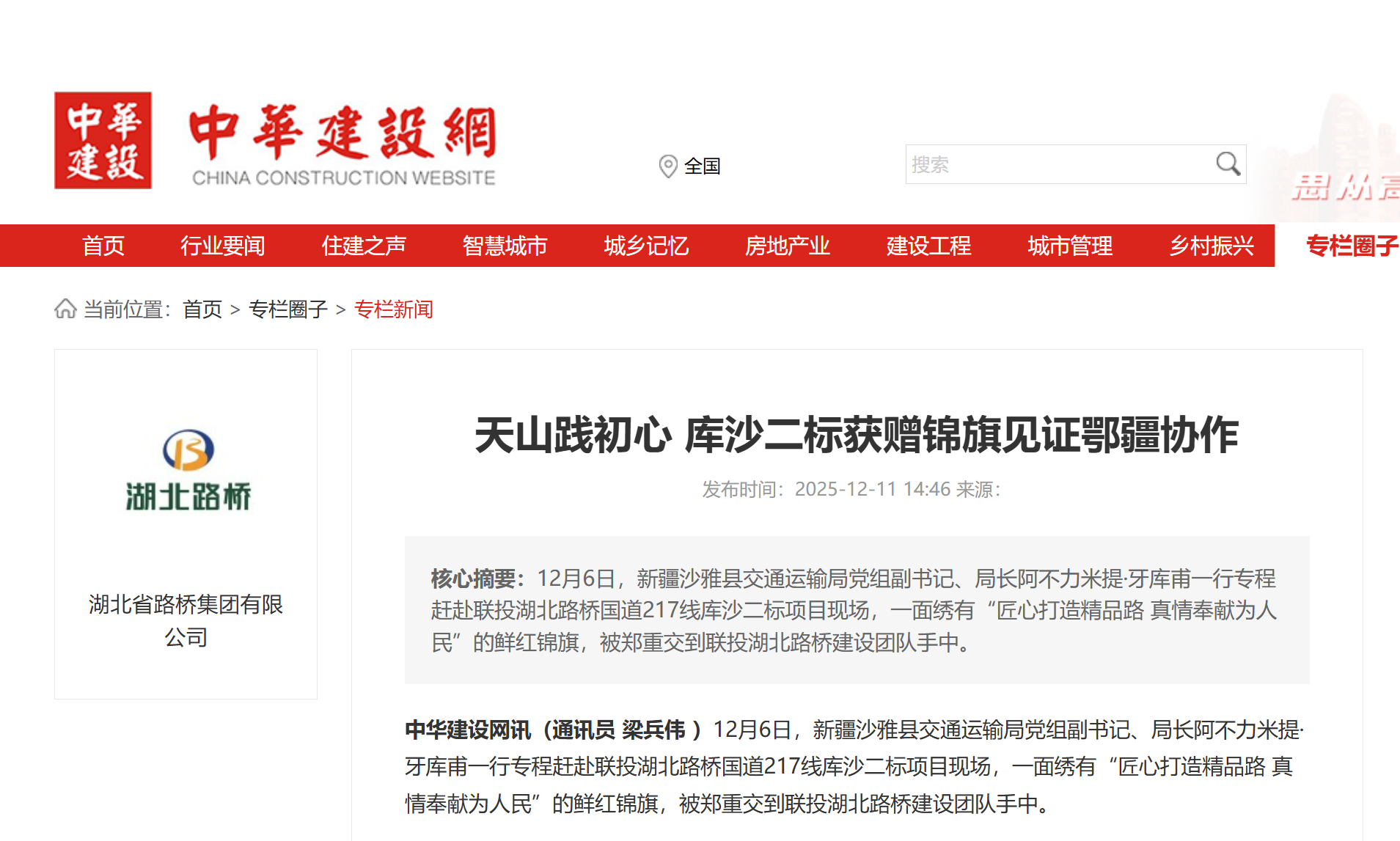 近日,联投海博体育国道217线库沙二标项目收到新疆沙雅县交通运输局的锦旗,中华建设网、经视直播对该事件进行报道,以下是报道全文: